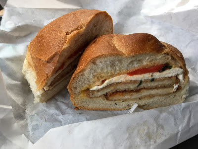 I opted for the smaller of the two sandwich sizes on offer, which is on a Kaiser roll instead of on the larger "wedge", a term that appears to be unique to the collar counties immediately north of New York City (Westchester, Putnam, and Fairfield in Connecticut) and essentially just means sub sandwich as far as I can tell (I'm on the lookout for more of these wedges around town). Even so, my Tammy was plenty large enough, offering two nicely breaded and fried chicken cutlets topped with slices of fresh mozzarella, roasted red peppers, and a slathering of honey mustard sauce, yielding a great combination of rich, chewy, sweet, and tangy ingredients (basically everything one could hope for in a sandwich). I wouldn't designated it as the best lunch ever, but I enjoyed it enough to contemplate a return trip the next time I happen to be in White Plains...